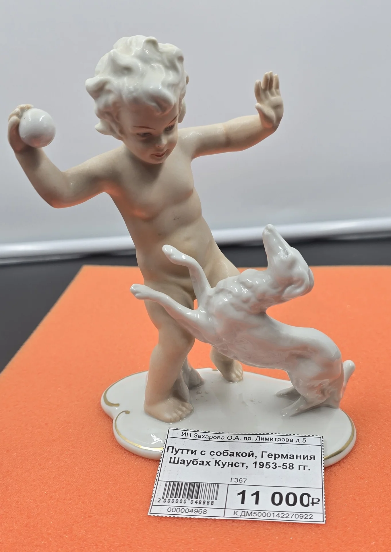 Статуэтка "Путти с собакой" из Германии, произведена компанией Шаубах Кунст в 1953–1958 годах. Малчик играет с собачкой и мячом, выполнен в нежных деталях и классическом стиле. Отличное дополнение коллекции или украшение интерьера.