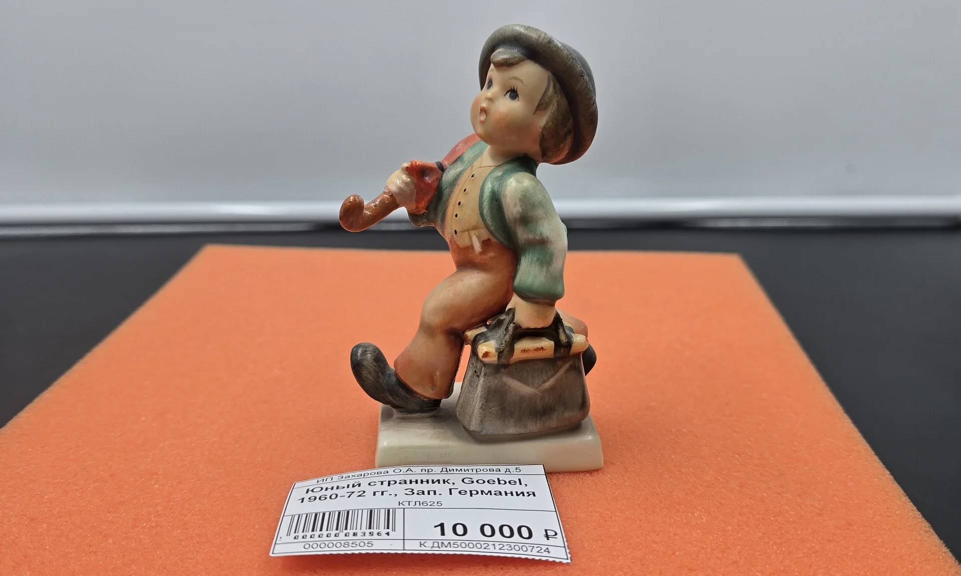 Статуэтка "Юный Странник" из Западной Германии, произведена компанией Goebel в 1960–1972 годах. Мальчик с зонтиком на плече и сумкой в другой руке, изображён в позе путешественника. Очаровательная и выразительная фигурка, идеально подойдет для коллекции или украшения интерьера.