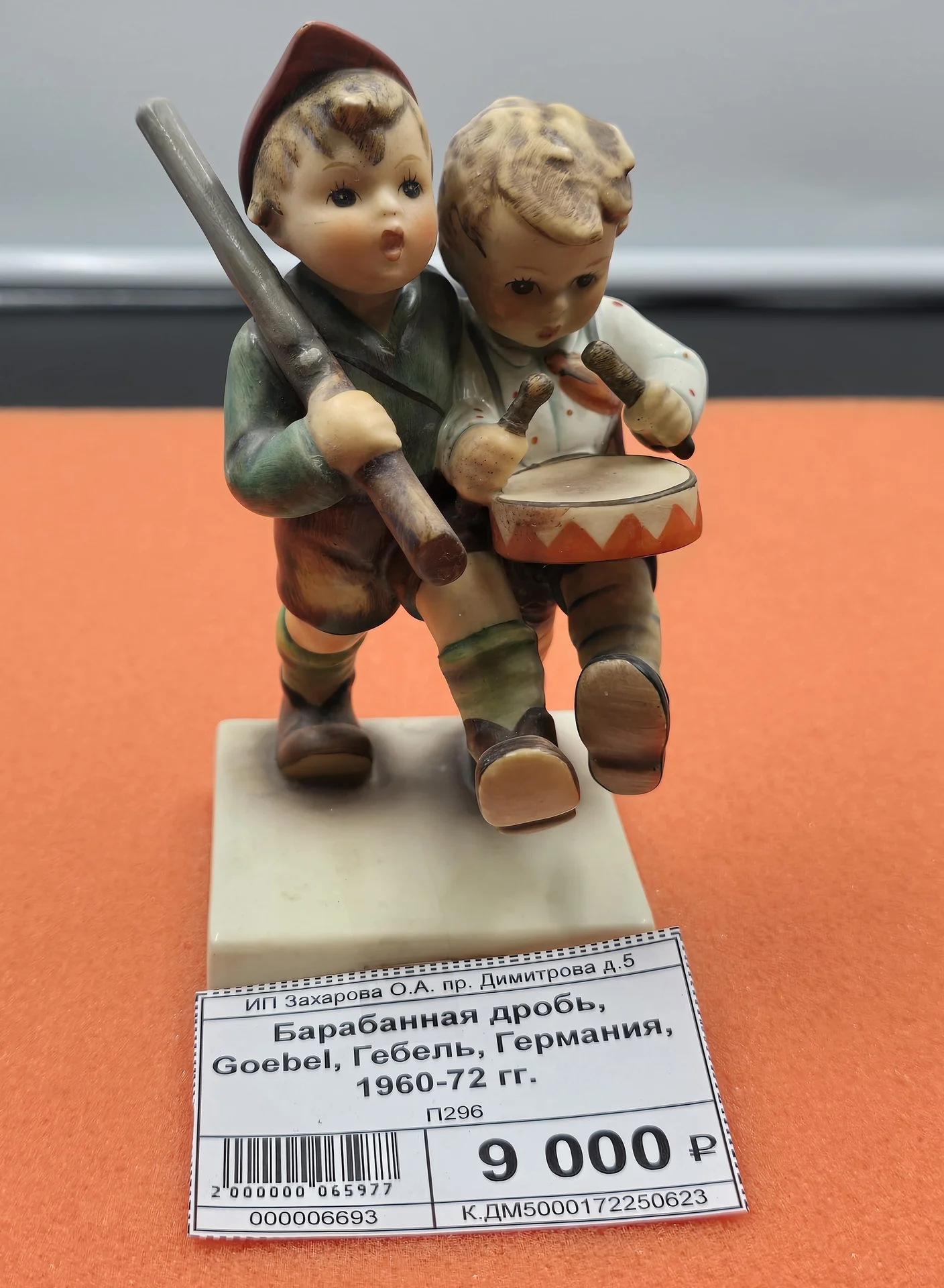 Статуэтка "Барабанная дробь" из Германии, произведена компанией Goebel в 1960–1972 годах. Два мальчика, один с ружьем, другой с барабанами, маршируют вместе, напоминаю скаутов. Живое и динамичное изображение, отлично подходит для коллекции или украшения интерьера.